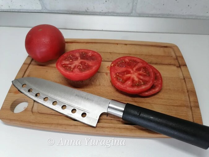 Pomidory należy pokroić na plastry o grubości około 1 cm.