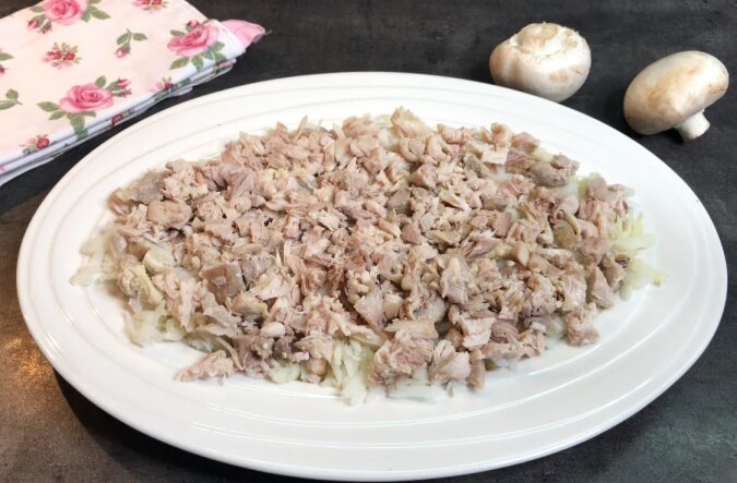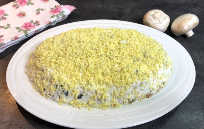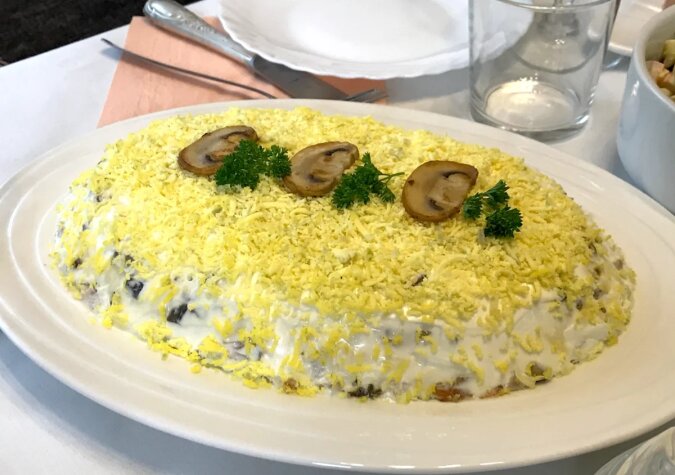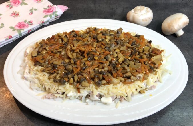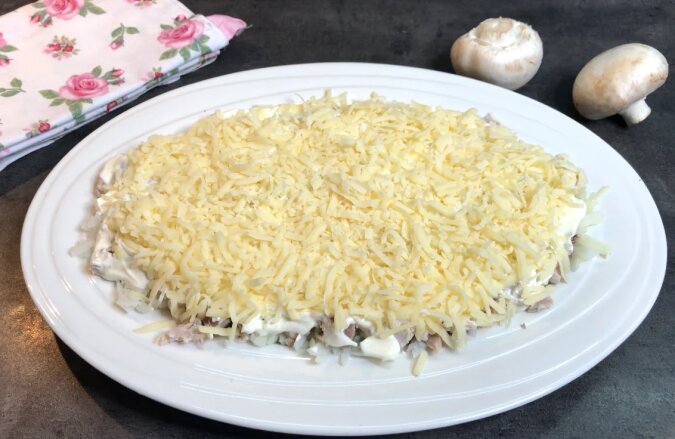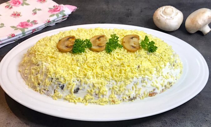Na wierzch starłam żółtka na drobnej tarce, przyozdobiłam smażonymi pieczarkami i natką pietruszki.