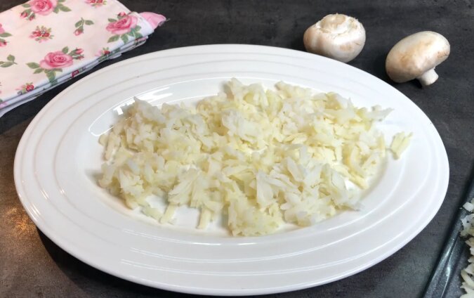Jajka starłam na grubej tarce i ułożyłam na grzybach, pozostawiając dwa żółtka.