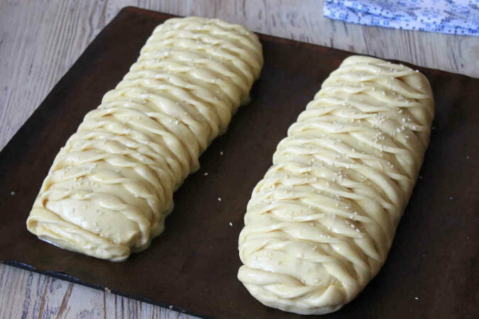 Wyłóż blachę do pieczenia pergaminem i ułóż tam ciasto. Posmaruj je żółtkiem i posyp sezamem. Piecz przez 35 minut w 180 stopniach.