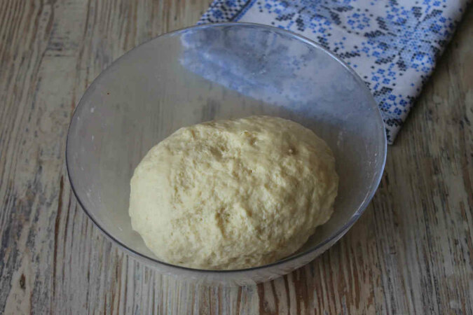 Aby zrobić ciasto, połącz kefir, roztopione masło, jajko i 1 łyżeczkę soli. Mąkę przesiej z proszkiem do pieczenia, zagnieć ciasto. Przykryj miskę folią i odstaw na 20 minut.