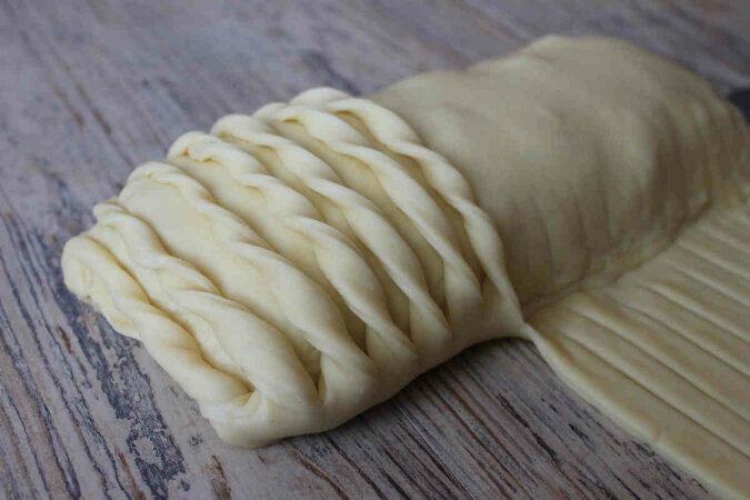 Przykryj nadzienie jedną częścią warstwy, mocno dociśnij brzegi. Pokrój drugą stronę ciasta w paski. Każdy pasek zwiń trochę w spiralę i przeciągnij przez ciasto.