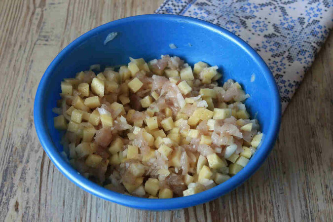 W międzyczasie zróbmy nadzienie. Pokrój filety i ziemniaki w drobną kostkę, dodaj posiekaną cebulę. Wlej olej roślinny, sól i pieprz, wymieszaj.