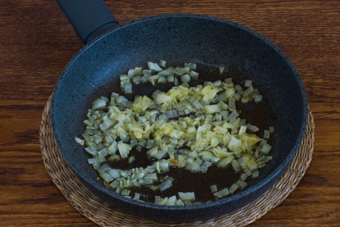 Pokrój cebulę i czosnek, usmaż na patelni, aż się zeszkli. Następnie dodaj grzyby i gotuj, aż płyn wyparuje.