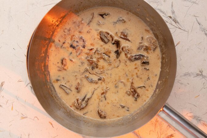 Dodaj grzyby do kremowego sosu i gotuj na wolnym ogniu, od czasu do czasu mieszając, przez kolejne 5 minut. Jeśli sos wydaje się zbyt gęsty, dodaj trochę mleka.