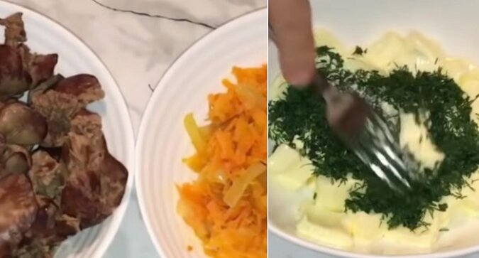 Przełóż do dwóch osobnych naczyń wątróbkę i warzywa, aby trochę ostygły - mogą pozostać ciepłe. W tym czasie można przygotować serowo-maślaną warstwę.