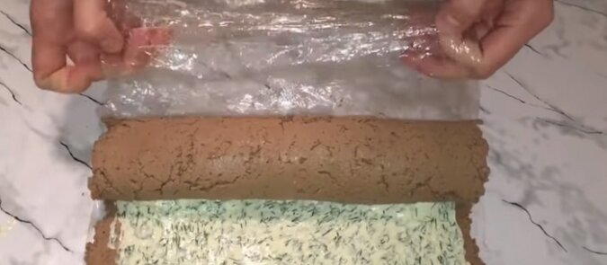 Delikatnie uformuj roladę, ciasno zawijając ją w folię. Przełóż roladę (szwem do dołu) do lodówki na około 3-5 godzin. Im dłużej będzie się chłodzić, tym będzie bardziej zwarta.