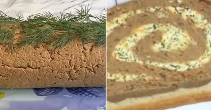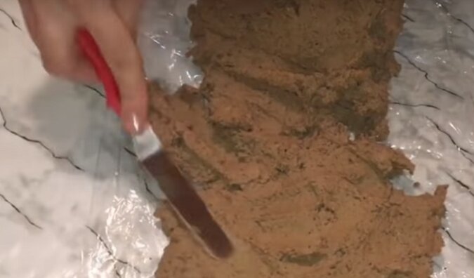 Na złożony na pół kawałek foli spożywczej wyłóż równomierną warstwę masy z wątróbki, ale uważaj, aby grubość warstwy wynosiła mniej więcej 3 milimetry na całej długości