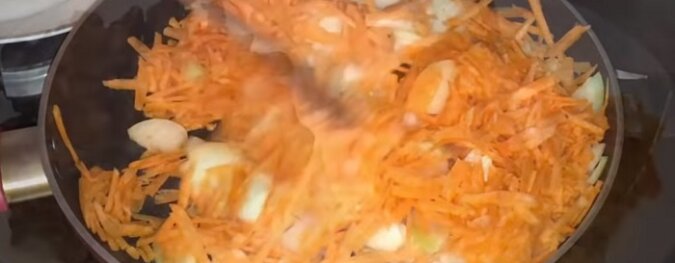 W czasie, kiedy wątróbka się gotuje, można przygotować do niej warzywa. Marchew zetrzyj na tarce, cebulę pokrój na niewielkie kawałki. Podsmaż cebulę i marchewkę na oleju roślinnym aż będą miękkie.