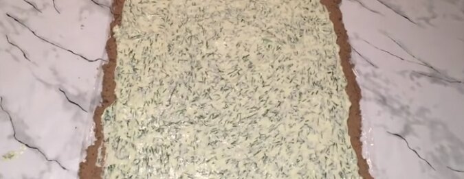 Na wierzch wątróbki, nie dochodząc do krawędzi, wyłóż serowo-maślaną warstwę.