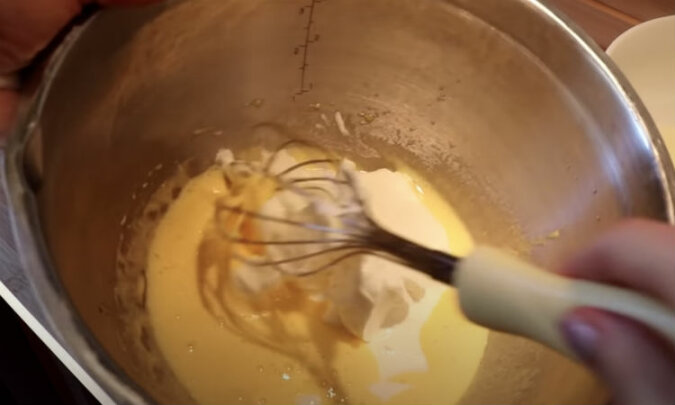Oddziel białka od żółtek, przełóż żółtka do głębokiej miski, dodaj cukier i wymieszaj trzepaczką. Dodaj do nich cały jogurt na raz, ponownie wymieszaj do uzyskania gładkiej masy i dodaj skrobię kukurydzianą, łyżeczkę proszku do pieczenia. Do tej samej miski zetrzyj skórkę z cytryny.