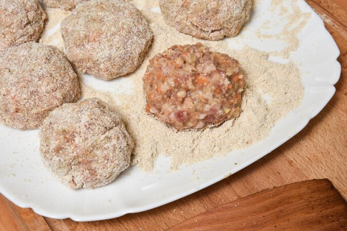 Teraz do mieszanki dodaj kaszę gryczaną, uformuj kotleciki lub pulpeciki, a następnie obtaczaj w mąkę.