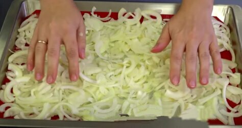 Cebulę należy oczyścić, zamoczyć w wodzie na jakiś czas i pokroić. Najlepiej na pół-pierścienia.