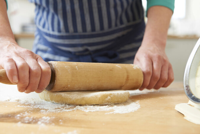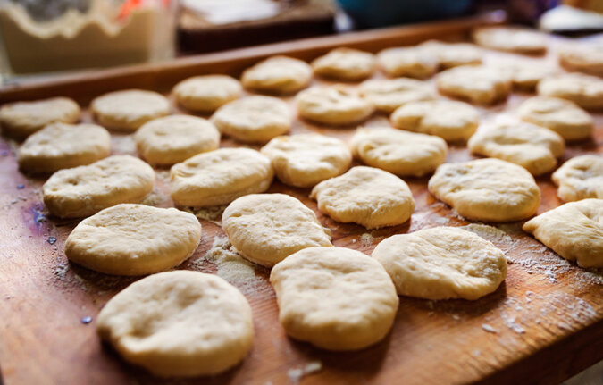 Ciasto podziel na 15-20 jednakowych części. Każdą część rozwałkuj na cienki placek.
