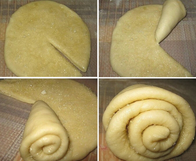 Aby uformować bułeczki, należy wykonać nacięcie od środka ciasta do krawędzi, a zatem ciasto zawinąć w rolkę.
