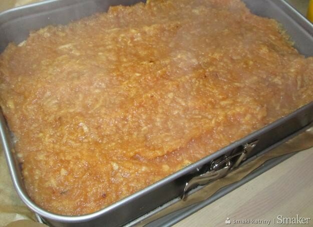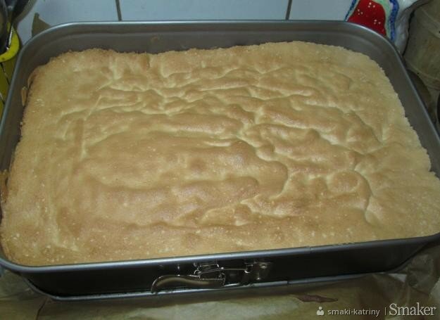 6. Wyłóż blachę papierem do pieczenia, połóż na niej ciasto, wyrównaj, a następnie piecz około pół godziny w 170 stopniach.