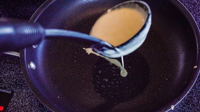 Ciasto wylewaj na rozgrzaną patelnie niewielkimi porcjami za pomocą chochelki lub łyżki. Smaż cienkie naleśniki z obu stron aż do zarumienienia.
