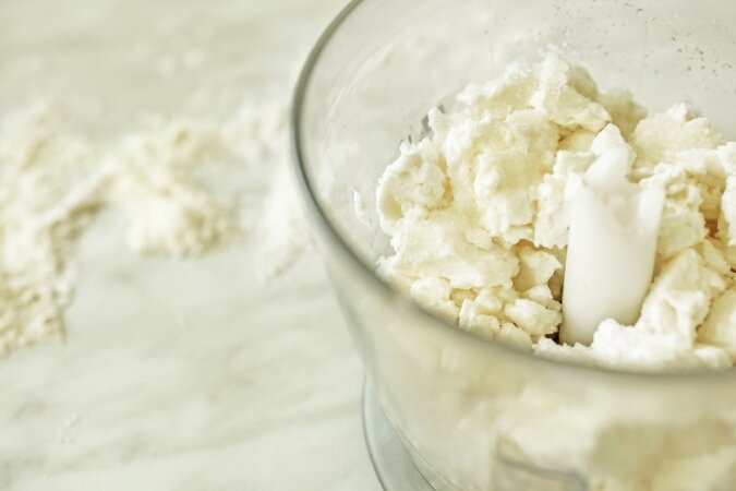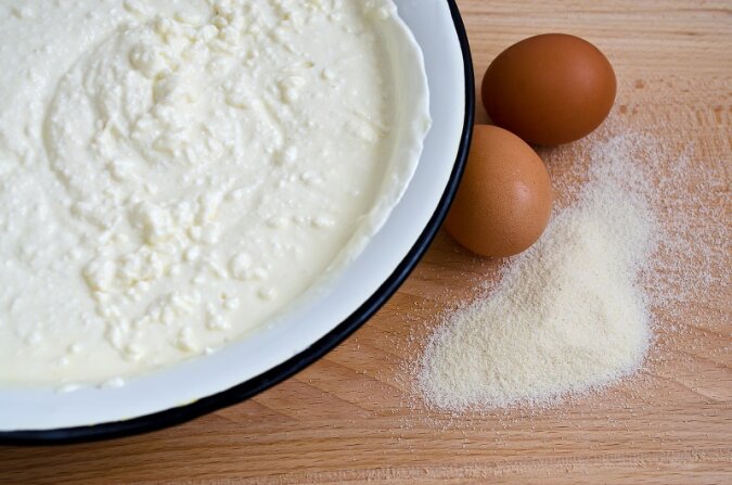 Twaróg, przesianą mąkę i mleko wymieszaj za pomocą blendera lub miksera.