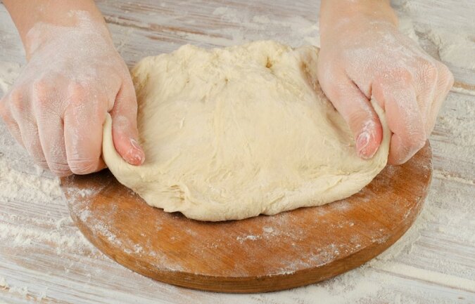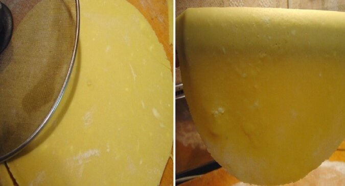 Teraz czas, aby wyciągnąć ciasto i rozdzielić je na cztery części. Rozwałkuj każdy kawałek, odetnij krawędzie, tak aby otrzymać ciasto o średnicy 30 cm. Odkrojone fragmenty odłóż na bok.