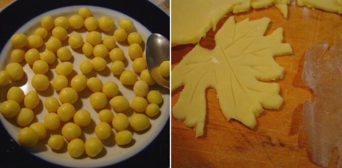 Póki stygną najlepiej zająć się dekoracją tortu. Oczywiście nie ma na to jednego sposobu - można zrobić cokolwiek tylko przyjdzie do głowy. W tym przypadku są to winogrona i listki. Aby wykonać taką właśnie dekorację wystarczy zrobić małe kuleczki. Za pomocą wyciętej z papieru formy, wykrój z ciasta 3 winogronowe liście. Wszystkie te elementy także upiecz na papierze.