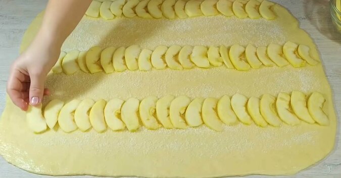 Ciasto posyp 100 g cukrem i równomiernie rozprowadź na powierzchni. Jabłka obierz, pokrój w ćwiartki i ułóż w trzech rzędach na cieście.