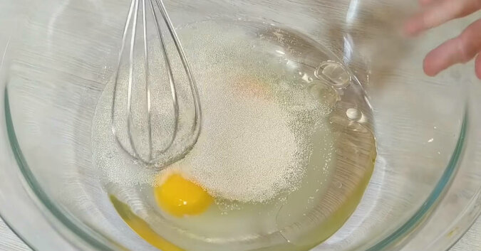 W głębokiej misce wymieszaj ciepłą wodę, drożdże, 70 g cukru, 2 jajka, sól i olej słonecznikowy. Ubij razem.
