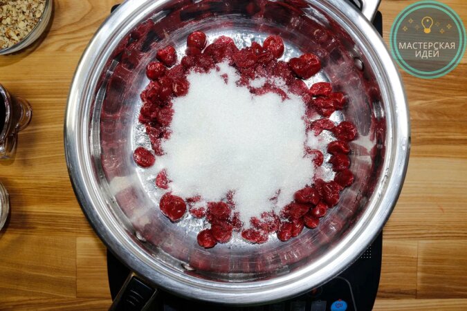Skrobię rozcieńczam 2-3 łyżkami soku i dodaję do gotujących się wiśni, mieszam i gotuję jeszcze przez kilka minut, aż nadzienie zgęstnieje. Zagęszczone wiśnie przekładam do talerza, dodaję posiekane orzechy włoskie, mieszam. Nadzienie jest gotowe!