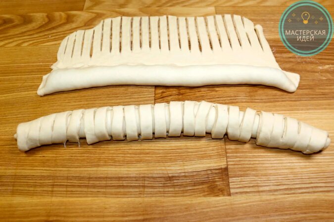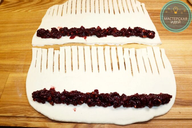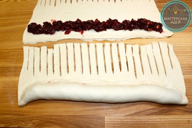 Zagniatam ciasto, które urosło i dzielę je na 2-3 części. Rozwałkowuję ciasto na placki o grubości około 3 mm i dzielę je na pół. Nadzienie rozprowadzam z jednej strony ciasta, pozostałe ciasto kroję z drugiej strony w cienkie paski, jak pokazano na zdjęciu.