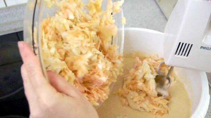 Następnie obierz jabłka ze skórki i wytnij środki, zetrzyj na grubej tarce i włóż do ciasta razem z posiekanymi orzechami.