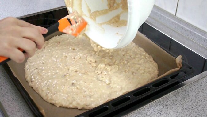 Przełóż ciasto na blachę wyłożoną papierem do pieczenia i wstaw do piekarnika nagrzanego do 160 stopni na 50 minut. Gotowe ciasto posyp cukrem pudrem.