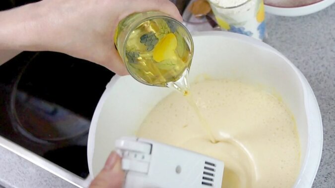 Następnie cienkim strumieniem wlej olej roślinny i wymieszaj masę przy niskich obrotach miksera.