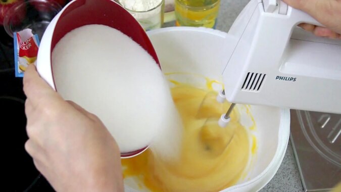 Za pomocą miksera w osobnym naczyniu ubij jajka z cukrem i cukrem waniliowym na puszystą masę.
