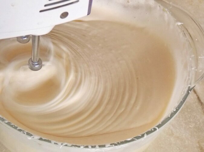 2. Dodaj śmietankę, 2 łyżki cukru, drożdże. Wymieszaj.