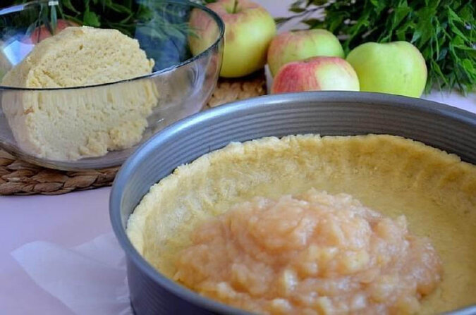 7. Cienko rozwałkować ciasto, przełożyć do formy wyłożonej papierem do pieczenia. Posyp bułką tartą, wyłóż nadzienie jabłkowe.