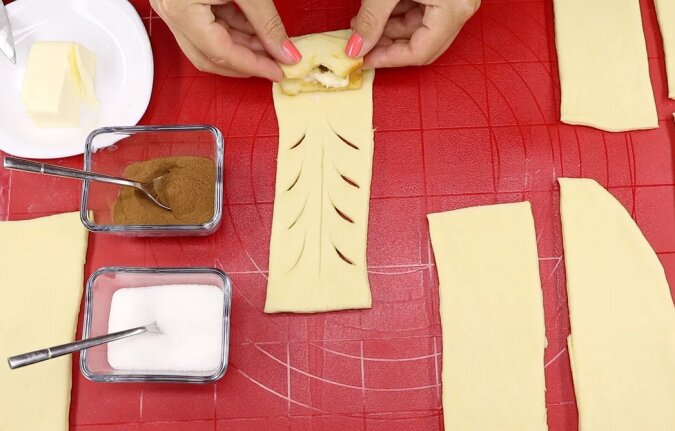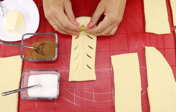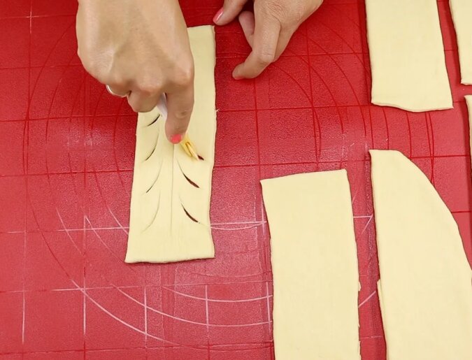 Teraz bierzemy jeden kawałek ciasta, wykonujemy długie nacięcie nożem i przecinamy nożem 4 zakrzywione linie z każdej strony.