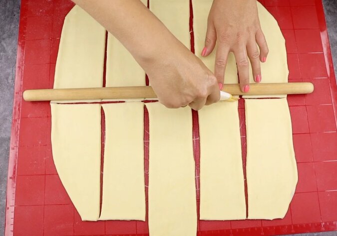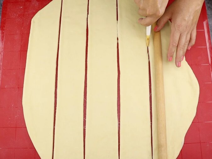 Następnie odetnij brzegi ciasta i całą warstwę pokrój w szerokie paski. Szerokość jednego paska to 8-9 cm, następnie przecinamy je na pół i otrzymujemy 10 wzorników na bułki.