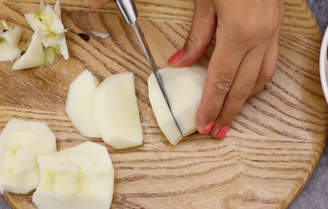 Gdy ciasto rośnie, przygotuj nadzienie. Dzisiaj będziemy mieli jabłkowe. Aby to zrobić, obierz 3 średnie jabłka, usuń nasiona i pokrój w duże plasterki. Do nadzienia potrzebujemy właśnie dużych kawałków jabłka.