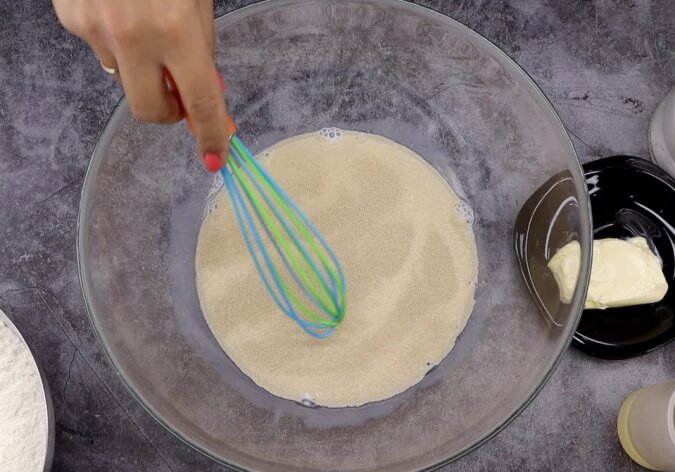Wlej 4 łyżki cukru do ciepłego mleka, 7 gramów suchych drożdży i dobrze wymieszaj trzepaczką. Przykryj cienkim ręcznikiem i pozostaw na 15 minut, aby uaktywnić drożdże.