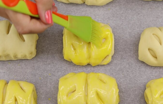 Następnie posmaruj je mieszanką żółtka i mleka. Wlej 1 łyżkę mleka do 1 żółtka i dobrze wymieszaj. Bułeczki smarujemy masą jajeczną i ustawiamy do pieczenia w nagrzanym piekarniku przez 20-22 minuty w temperaturze 180 stopni.