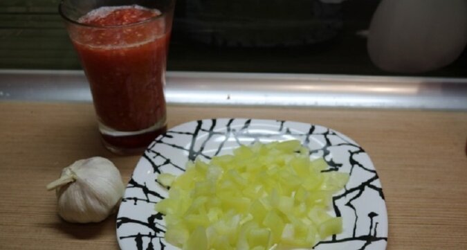 W międzyczasie wyciśnij sok w pomidorów (w jakikolwiek możliwy sposób), a następnie paprykę pokrój w małe kostki.
