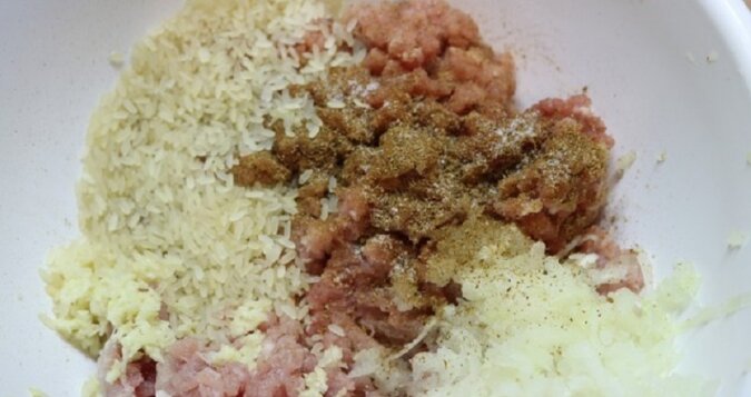 Cebulę zetrzyj na tarce o grubych oczkach, a następnie dodaj do mięsa mielonego. Czosnek wyciśnij przez prasę do czosnku i również dodaj do mięsa. Także dodaj nieugotowany ryż, sól oraz ulubione przyprawy. Wszystko dokładnie wymieszaj.