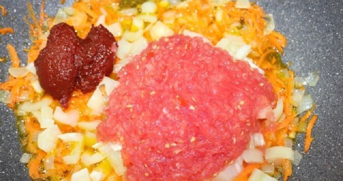Do marchwi dodaj posiekaną paprykę, a także sok pomidorowy i koncentrat pomidorowy. Wlej 300-400 ml wody, dodaj soli i pieprzu do smaku. Możesz również dodać trochę cukru. Następnie duś na wolnym ogniu 5-10 minut.