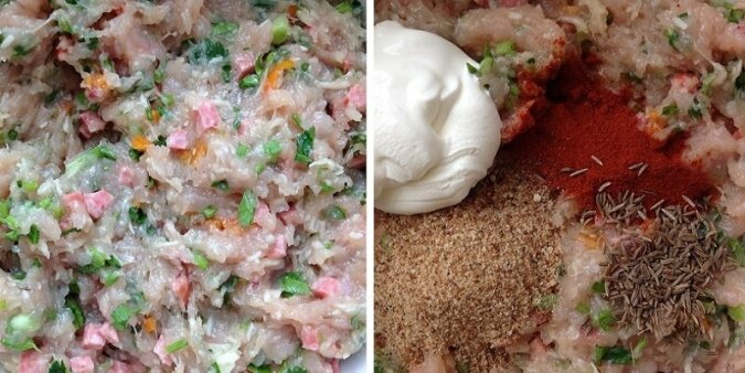 Obierz i posiekaj cebulę i dodaj chili. Dobrze wymieszaj wszystkie wymienione składniki. Dodaj do nich śmietanę, kminek, paprykę, sól i bułkę tartą.