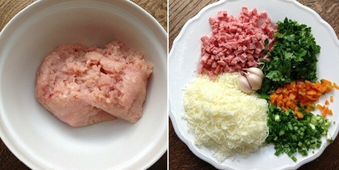 Porządnie ubij schłodzone mięso mielone przy użyciu robota kuchennego. Salami pokrój w drobną kostkę, zetrzyj ser na grubej tarce. Posiekaj natkę pietruszki.