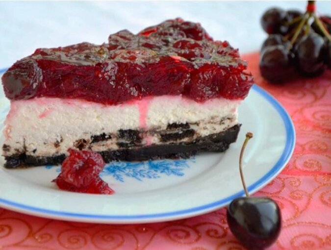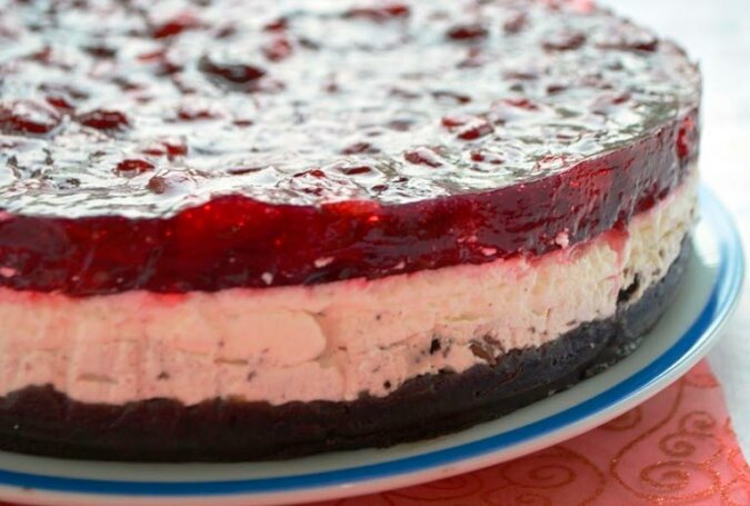 Otrzymaną masę wlewamy na wierzch ciasta, znajdującego się w formie, a następnie wstawiamy do lodówki. Teraz przygotowujemy galaretkę wiśniową. Galaretkę łączymy z wiśniami, zatem odstawiamy do wystygnięcia. Polewamy ciasto galaretką. Zatem wstawiamy do lodówki na 6 godzin. Po upływie tego czasu możemy podawać. Życzymy wszystkim smacznego!