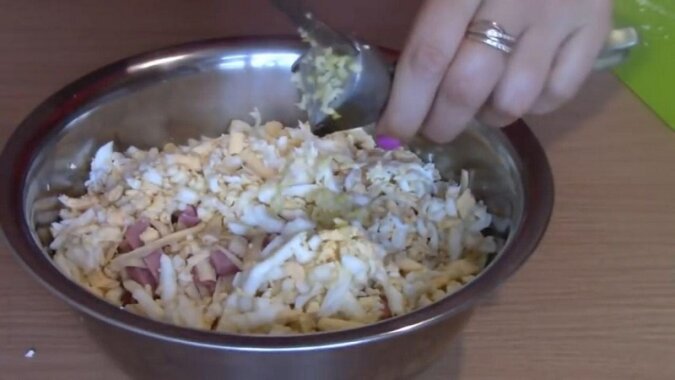 Przepuść czosnek przez praskę i dodaj do wszystkich pozostałych składników. Dodaj sól, pieprz i wymieszaj. Dodaj do sałatki majonez. To wszystko, możesz podawać do stołu!