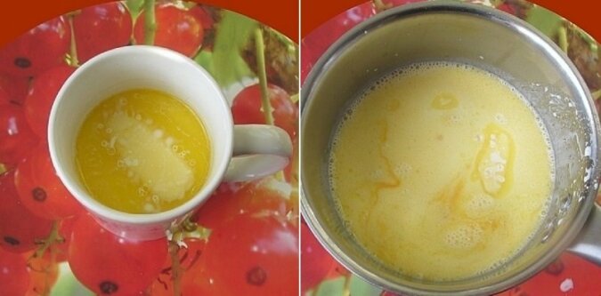 2. Płyn z kuchenki mikrofalowej wlej do rondla. Dodaj tam cukier i żółtka, energicznie wymieszaj powstałą masę trzepaczką.