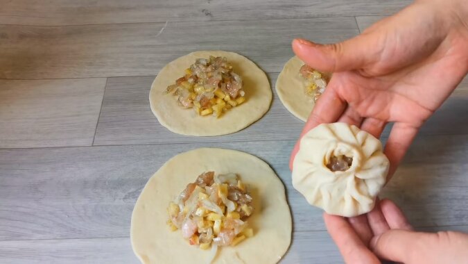 Umieść nadzienie na środku. Weź brzeg ciasta i połącz je na środku, tak aby powstał mały otwór.