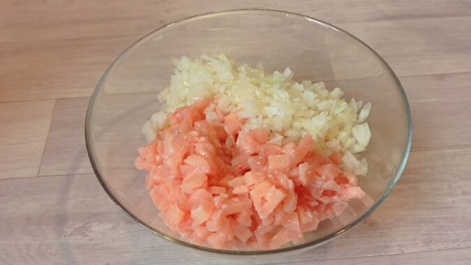 W tym czasie przygotuj nadzienie. Ziemniaki i cebulę należy umyć, obrać i pokroić w drobną kostkę. Kurczaka też pokrój w drobną kostkę.