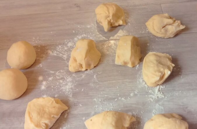 Ciasto podzieli na około 10-12 równych części. Z każdej części uformuj kulkę, a następnie rozwałkuj je tak, aby uzyskać równe cienkie kółka.